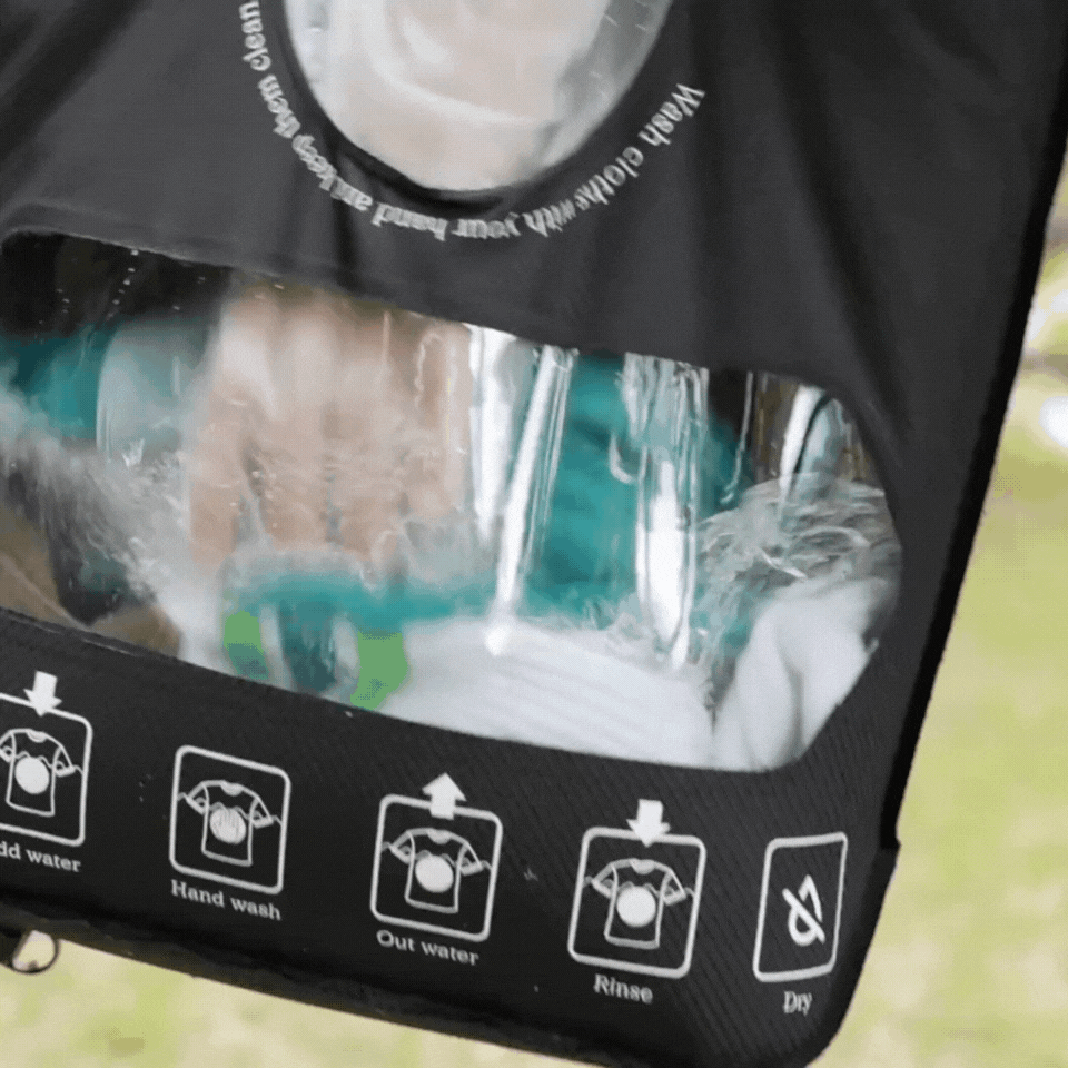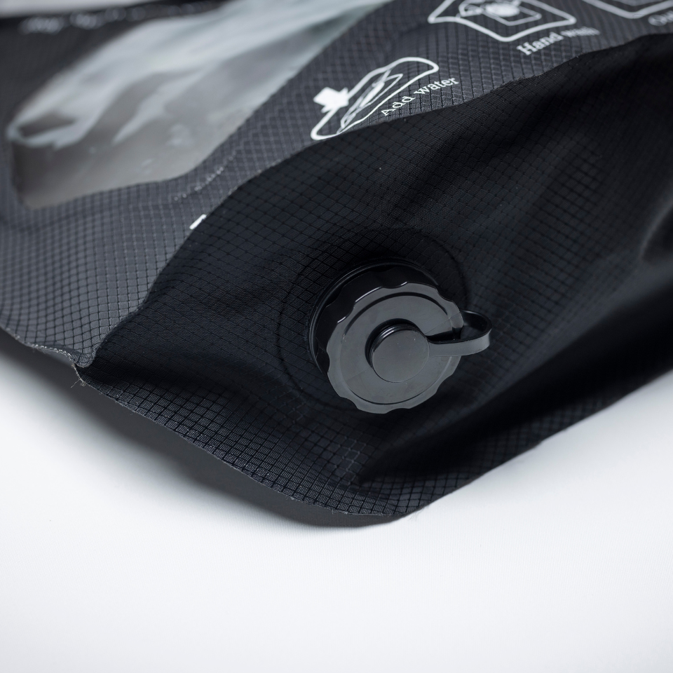 排水後、バルブを開けたまま、バッグを丸めながら衣類に残った水分を脱水します。