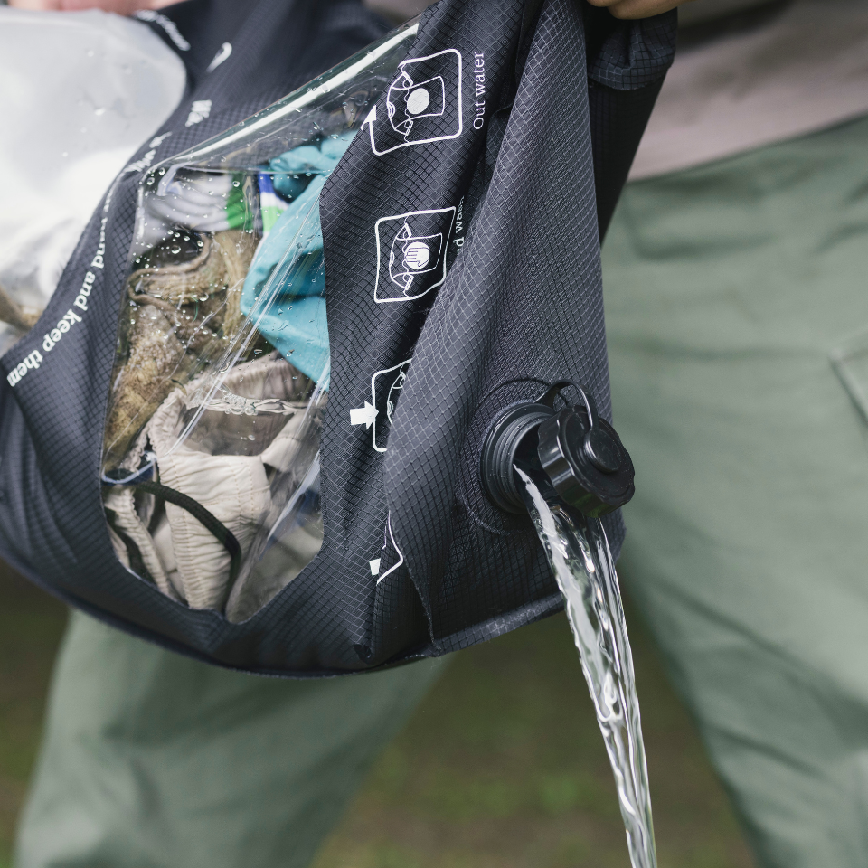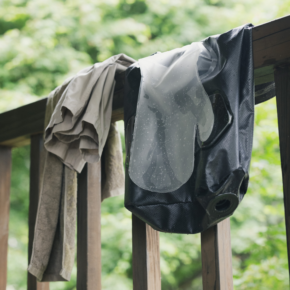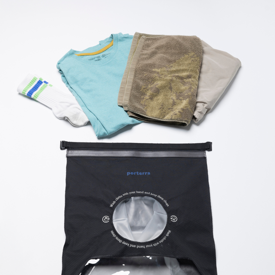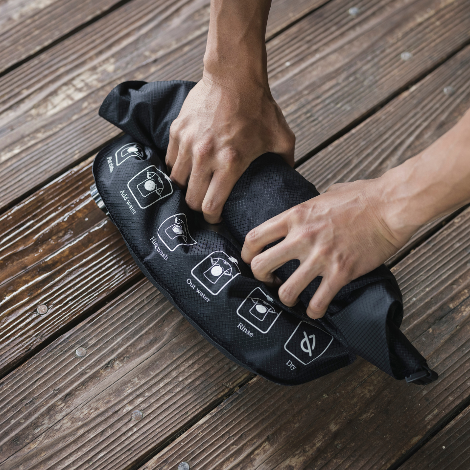 使い終わった後はバッグを簡単に裏返すことが可能です。撥水性のある生地はタオルで拭き取るか、衣類と一緒に自然乾燥させることで清潔に保てます。