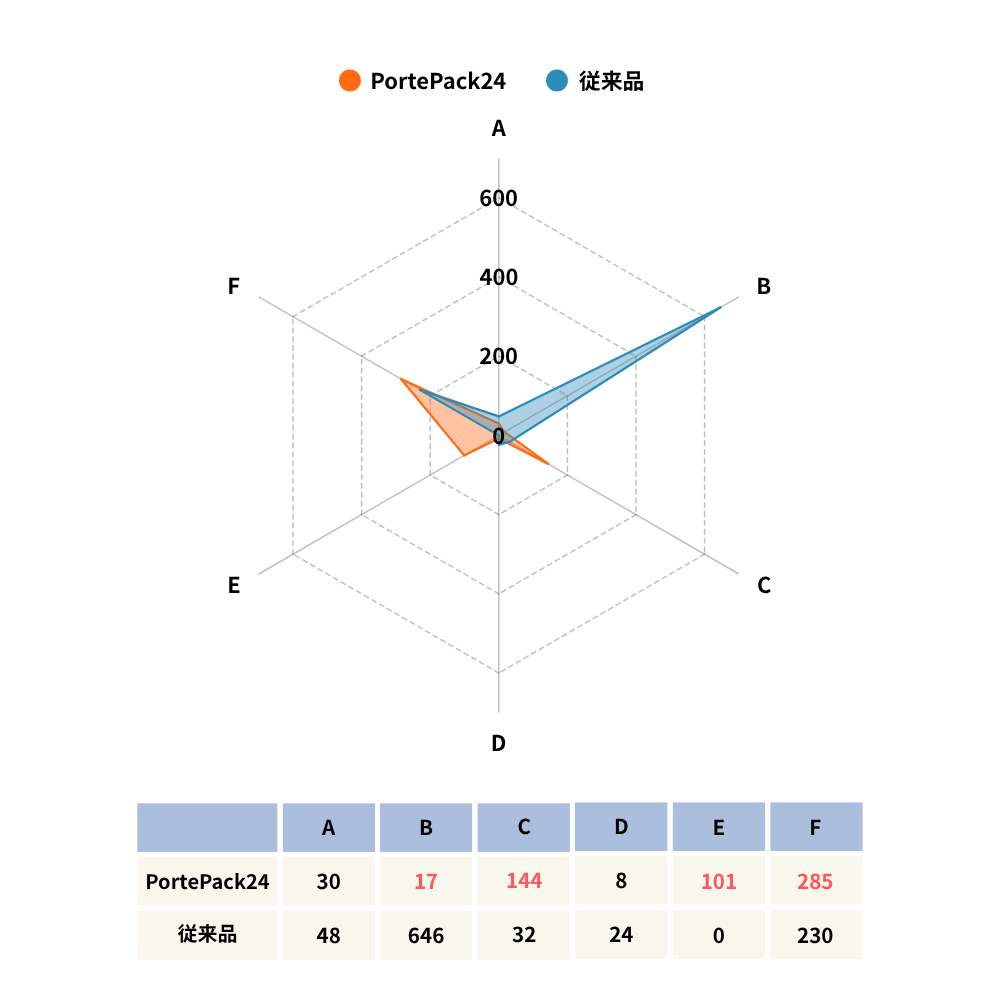 PortePack24は背中(E)、腰(F)胸(C)への荷重が従来品と比べ高くなっており、肩(B)部分への負荷をうまく体全体へ分散させられていることがわかります。それにより、荷物を背負った際に感じる重さを大幅に軽減することが可能です。